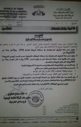 شركة النفط بحضرموت ترفع سعر البترول من 250 إلى 270 للتر الواحد
