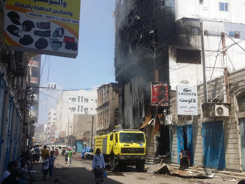فرق الإطفاء تتمكن من اخماد حريق هائل في احدى المباني السكنية والمحلات التجارية بعدن