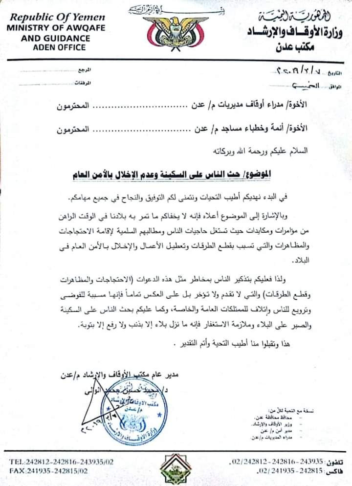 قال تعميم صادر عن مكتب اوقاف عدن بأن الاحتجاجات والماظاهرات لاتقدم ولاتؤخر ومسببة للفوضى وترويع الناس واتلاف الممتلكات الخاصة والعامة.