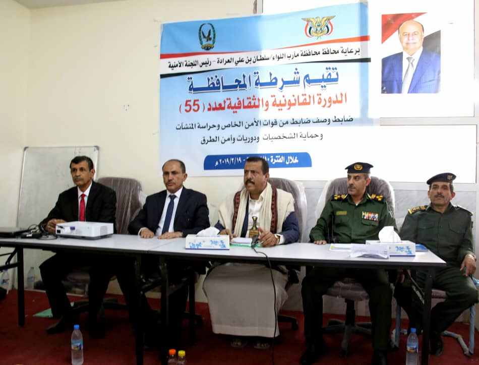 دشنت شرطة محافظة مأرب، اليوم الأحد، البرنامج التدريبي للربع الأول من العام الجاري، بالدورة القانونية والثقافية لعدد "55" ضابط وصف ضابط من قوات الأمن الخاص وحراسة المنشآت وحماية الشخصيات وشرطة الدوريات وأمن الطرق.