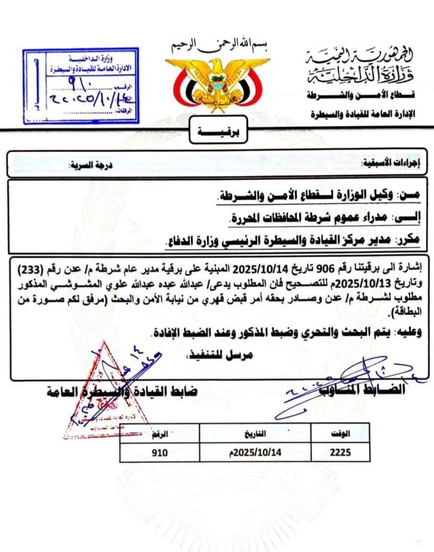وتصاعدت في الأوساط القبلية والمجتمعية دعوات تُحمِّل قائد اللواء الثالث دعم وإسناد نبيل المشوشي المسؤولية الكاملة عن تهريب وحماية المتهمين، مطالبةً إياه بتسليم عبدالله المشوشي فورًا إلى إدارة البحث الجنائي، باعتبارها الجهة الرسمية المخولة بالتحقيق في جريمة اغتيال الشيخ العقربي.