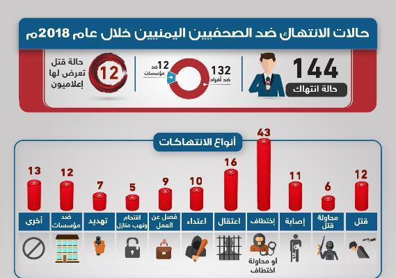 أعلن مرصد الحريات الاعلامية في اليمن عن تسجيل 144 انتهاك ضد الحريات الاعلامية في اليمن خلال العام 2018 منها 12 حالة قتل تعرض لها اعلاميين، كما تعددت الانتهاكات بين القتل والاصابة والاختطاف والاعتداء واستهداف المؤسسات الإعلامية.