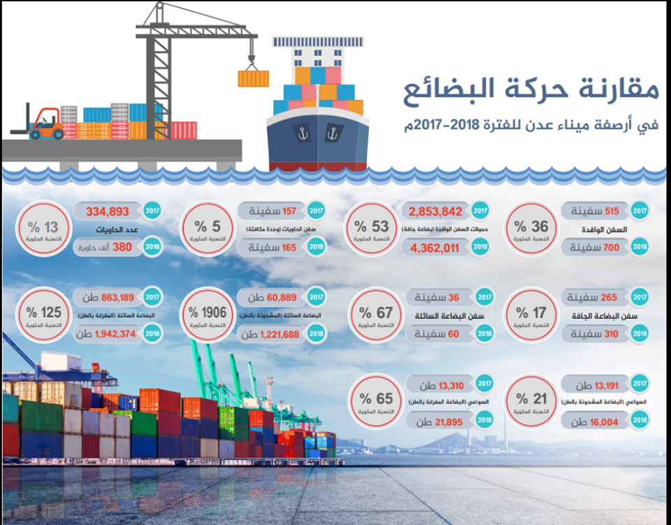 و هذا يمثل مؤشراً جيداً على حالة التعافي التدريجي التي يعيشها ميناء عدن، ليواصل الميناء رحلته نحو استعادة مكانته الطبيعية والمحورية على مسار النقل البحري، باعتباره واحداً من أهم مؤسسات الدولة اليمنية، وذكرت الإحصاءات الرسمية، الصادرة عن مؤسسة موانئ خليج عدن، أن عدد السفن الوافدة إلى ميناء عدن خلال العام المنصرم 2018م، بلغت 700 سفينة، بزيادة تقدر نسبتها 36%، عن عددها خلال الفترة نفسها للعام قبل الماضي 2017م. ووصلت نسبة الزيادة في سفن الحاويات خلال العام المنصرم، إلى 5%، إذ بلغت 165 سفينة، بزيادة تمان سفن عن العام 2017م.في حين بلغت نسبة الزيادة في عدد الحاويات 13% حيث بلغ عددها 380 الف حاوية للعام المنصرم 2018م.