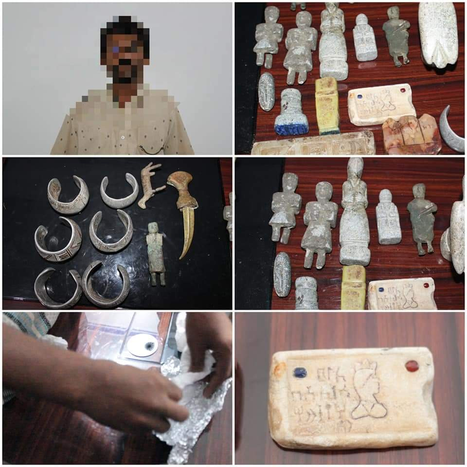 مدير أمن الشحر العقيد عوض بن عكاس العوبثاني قال أن المواطن بحوزته قطع أثرية قديمة وهي عبارة تماثيل صغيرة برونزية ، وقطع حجرية عليها نقوش ورسومات بالخط المسند ، وخنجر من مادة النحاس، ومجموعة قطع برونزية عضاض ( حلي مزينة بنقوش تستخدم في الأيدي والأرجل للزينة ويرجح أن يعود أصلها لممالك اليمنية القديمة .