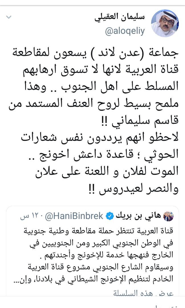 وارجع العقيلي دعوة بن بريك لمقاطعة قناة (العربية) لانها لا تسوق ارهابهم المسلط على اهل الجنوب.
