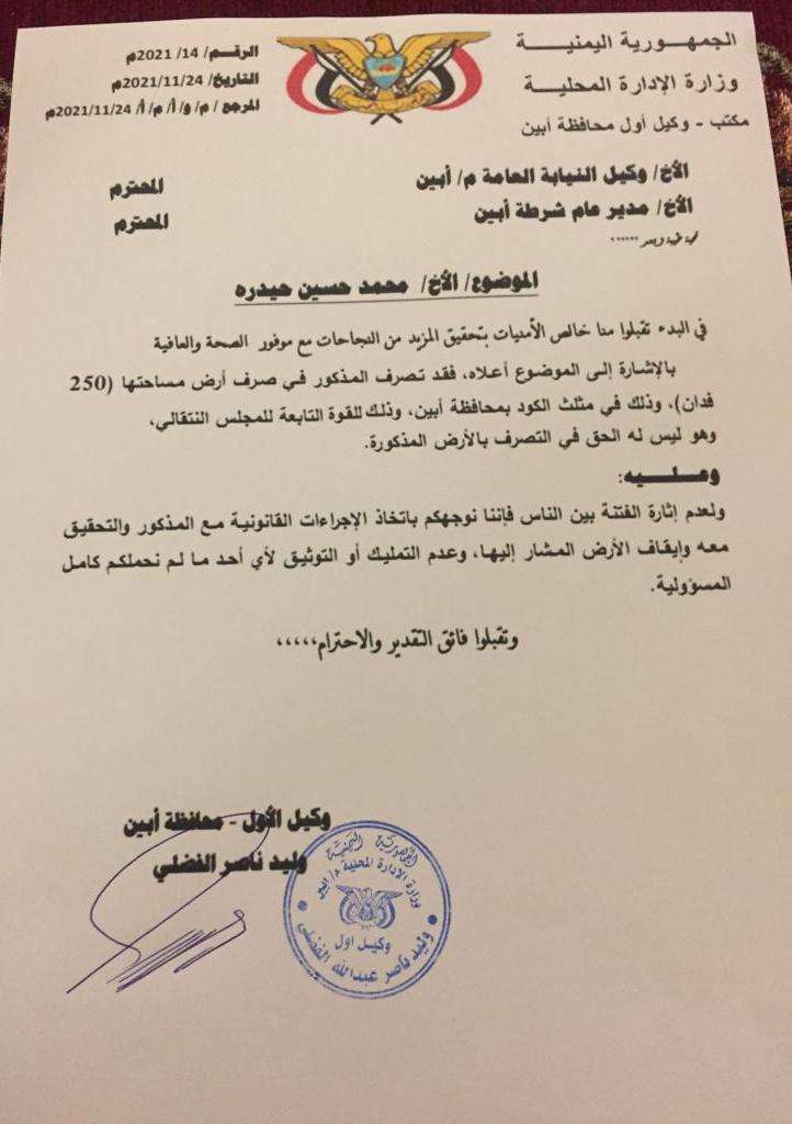 وجه وكيل أول محافظة أبين الشيخ وليد بن ناصر الفضلي وكيل النيابة العامة بالمحافظة ومدير الأمن باتخاذ الإجراءات القانونية مع المدعو محمد حسين حيدرة لتصرفه غير القانوني المتمثل بصرف أرض مساحتها 250 فدان الواقعة في مثلث الكود بمديرية خنفر.