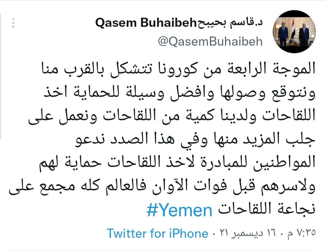 جاء ذلك خلال تغريدة له على حسابه بموقع تويتر، التي قال فيها "الموجة الرابعة من كورونا تتشكل بالقرب منا ونتوقع وصولها وافضل وسيلة للحماية اخذ اللقاحات".