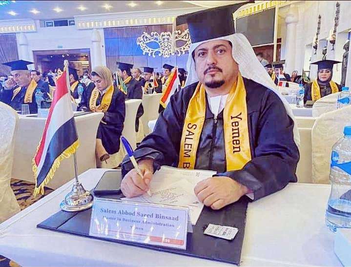 نال الباحث اليمني سالم عبود سعيد بن سعد درجة الماجستير بامتياز في إدارة الأعمال من المعهد البريطاني للدراسات العليا بمصر عن رسالته الموسومة "أثر القرارات الاستراتيجية على نسب المبيعات في ظل نظرية الظروف الطارئة".