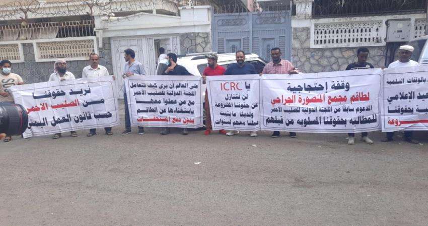 عمال وموظفو طاقم مجمع المنصورة الجراحي ينظمون وقفة احتجاجية أمام مقر الصليب الأحمر الدولي في عدن