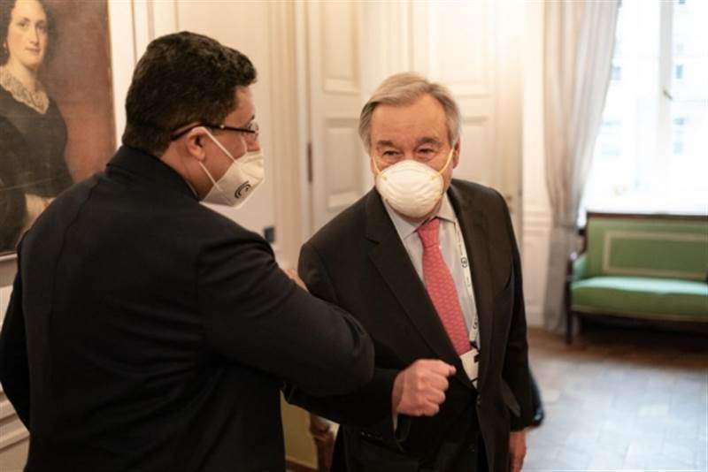 بحث وزير الخارجية وشئون المغتربين الدكتور أحمد عوض بن مبارك، اليوم، مع أمين عام الأمم المتحدة أنطونيو غوتيريش، الأوضاع الانسانية ومسارات عملية السلام في اليمن.