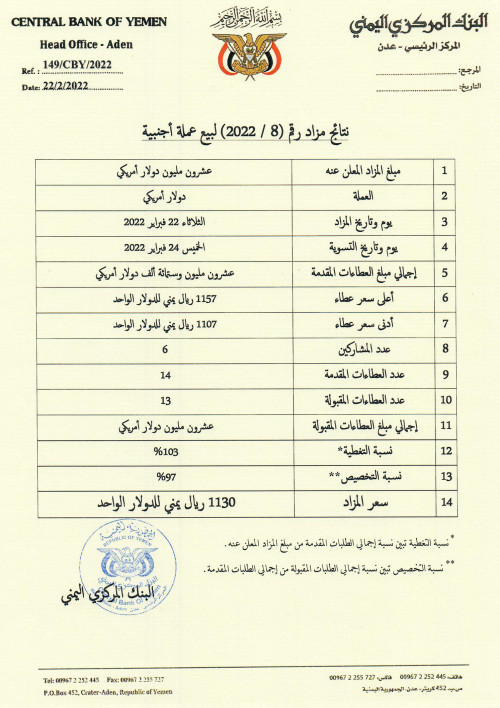 البنك المركزي اليمني يعلن عن نتائج المزاد رقم (8-2022) لبيع عملة أجنبية
