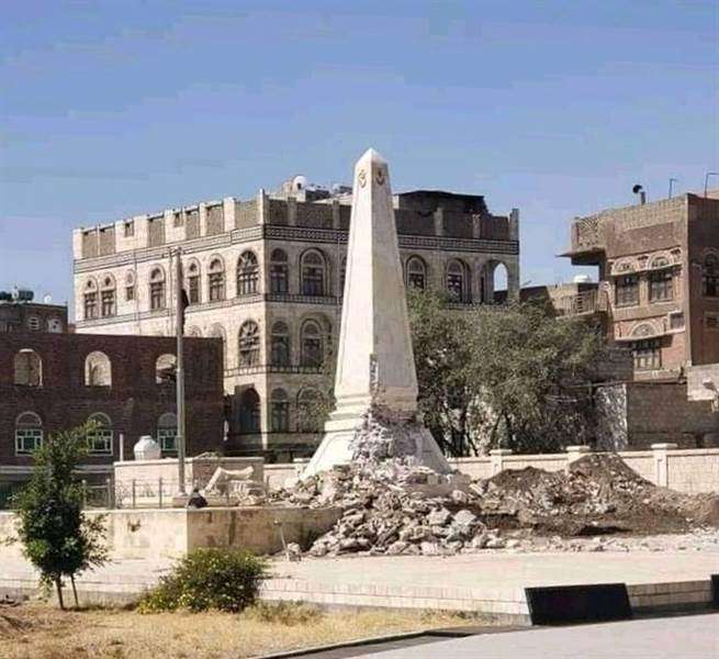 وتداول ناشطون صورا على منصات التواصل الاجتماعي "فيسبوك" صورا لمعدات حوثية تهدم النصب التذكاري التركي، الكائن في محيط وزارة الدفاع، خارج سور صنعاء القديمة.
